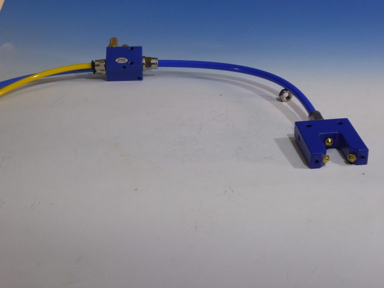 Bei der Minimalmengenschmierung "MMS" werden Band- und Kreissägen mit Gabeldüsen ausgestattet. Von beiden Seiten wird das Sägeblatt im Zahnbereich mit Schmiermittel besprüht, bei dickwandigen Werkstücken mit tiefen Sägeschnitten noch zusätzlich durch eine 3te Düse im Gabelgrund. Aus Platzgründen werden die Gabeldüsen mit einer getrennten Regulierungseinheit betrieben, die Versorgung mit Schmiermittel und Sprühluft erfolgt durch einen Koax-Schlauch.