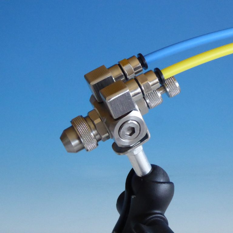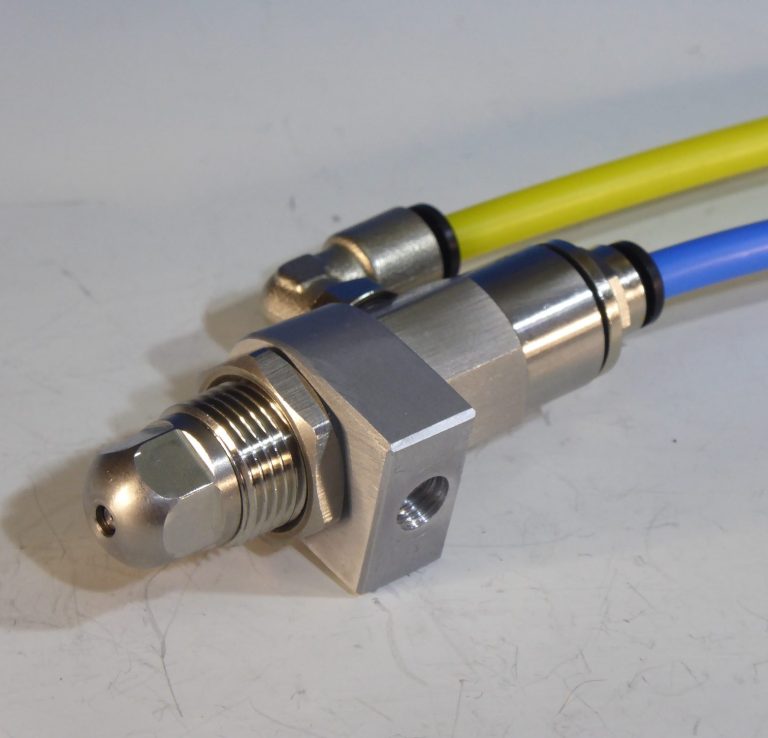 In der Düse wird der Schmierstoff mit der Druckluft vermischt und als Aerosol auf das Werkstück/Werkzeug aufgesprüht. Der Sprühnebel kann je nach Druck- und Mengeneinstellung bis zur Tröpfchenbildung verändert werden.